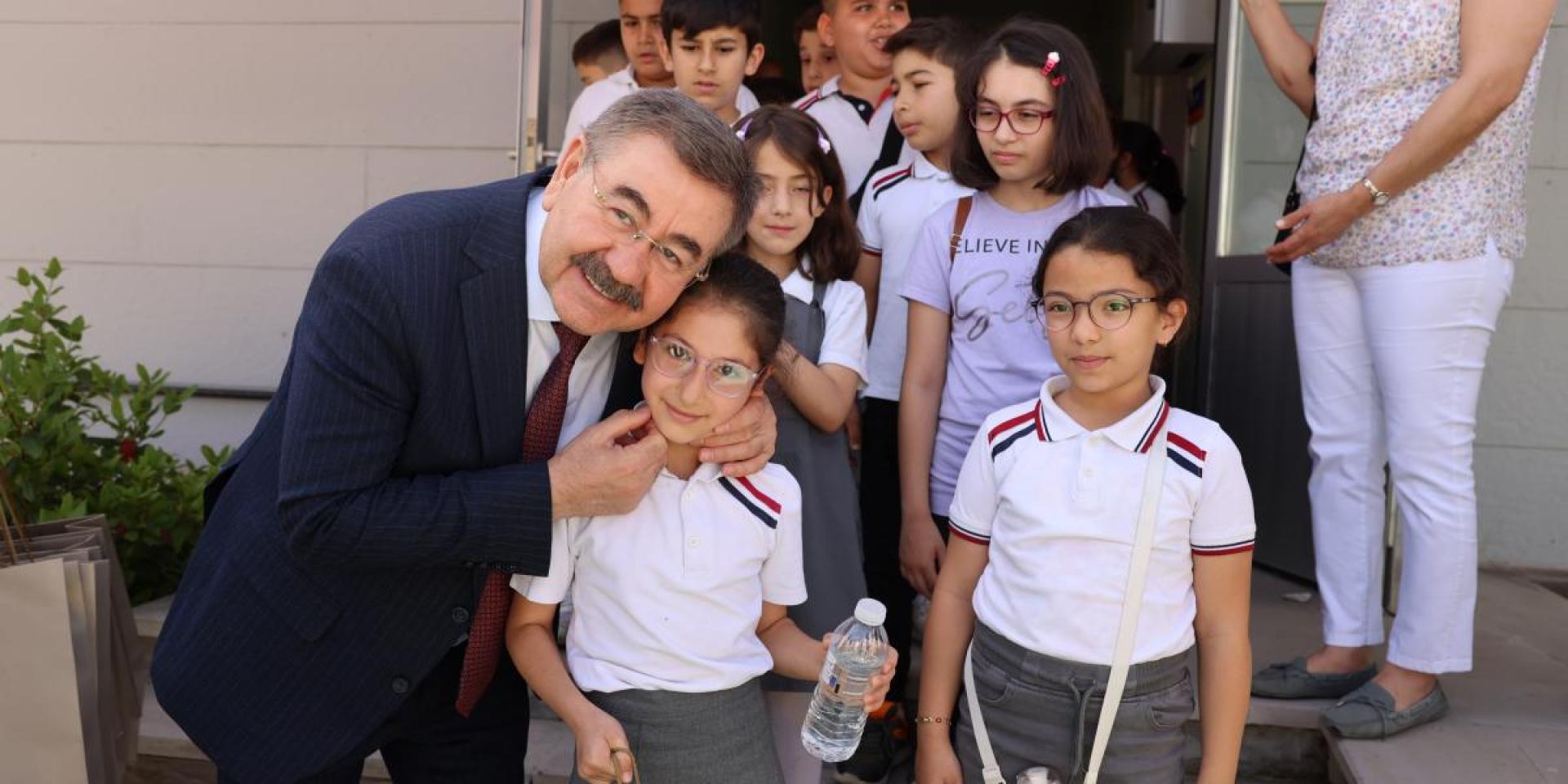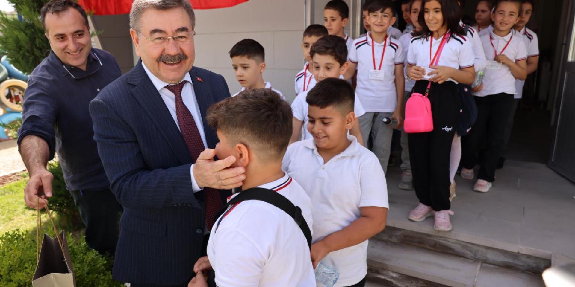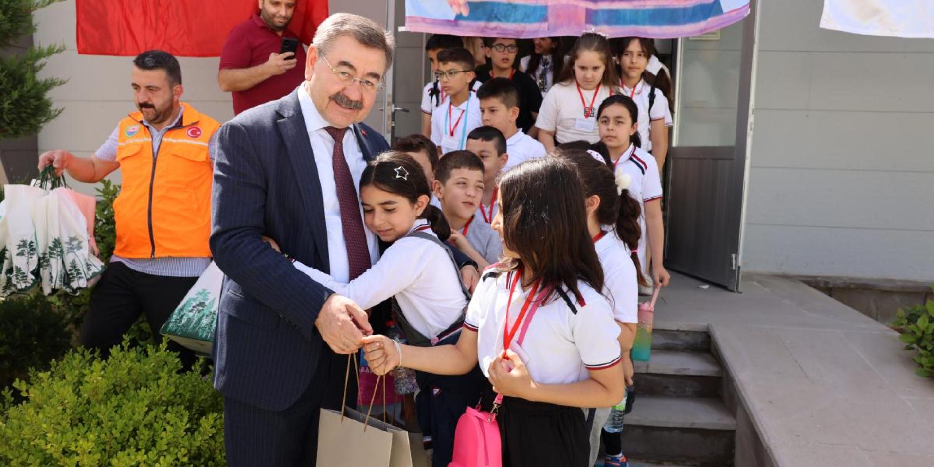 Gölbaşı Belediye Başkanı Yakup Odabaşı, öğrencilere atık malzemelerden yapılan doğa dostu oyuncakları hediye etti.