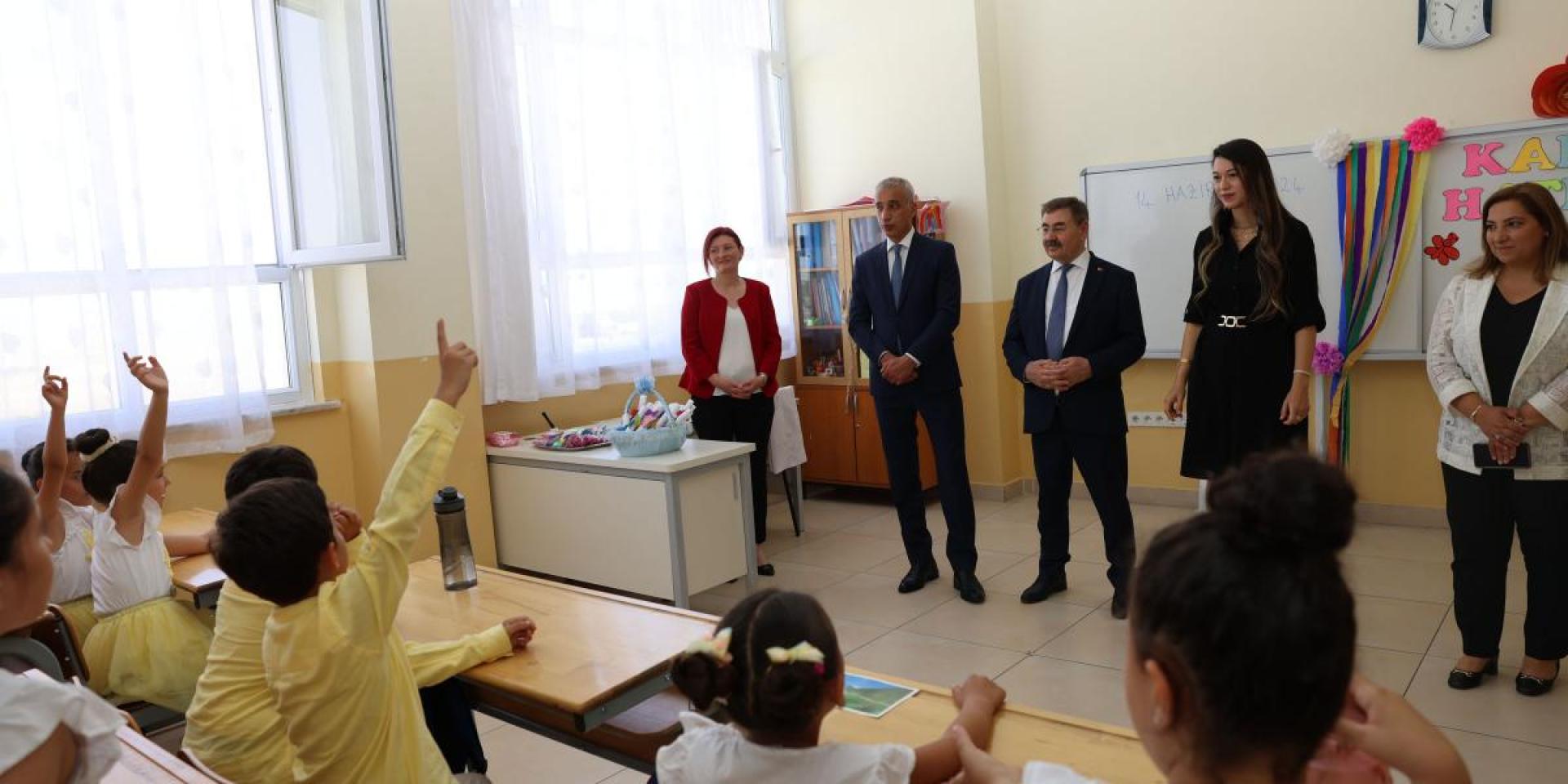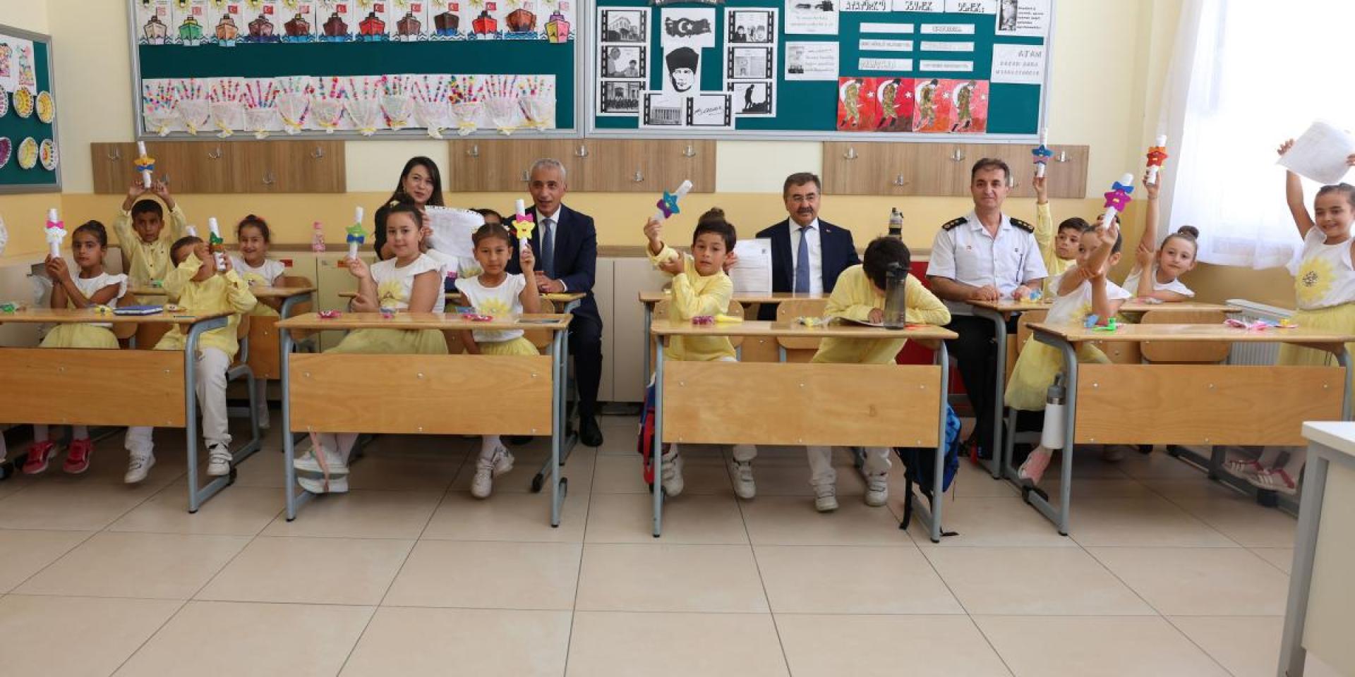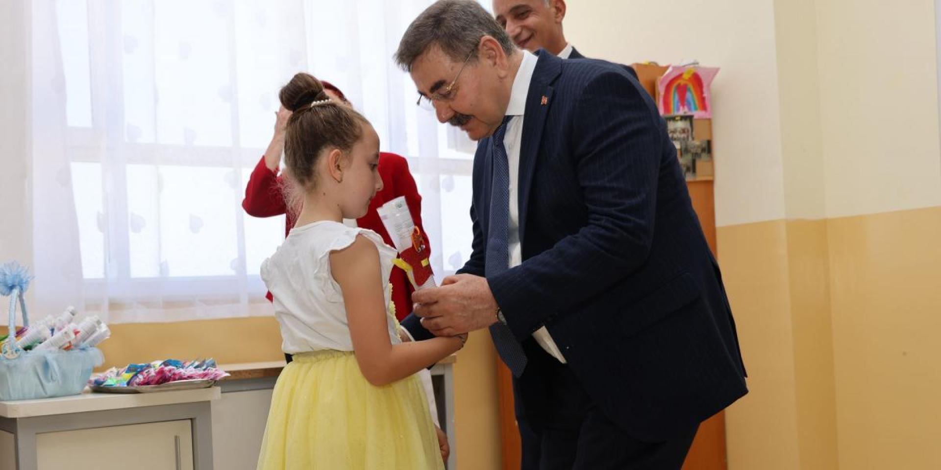 giren Başkan Odabaşı ve Kaymakam Rüstemoğlu, öğrencilere karnelerini dağıtarak
