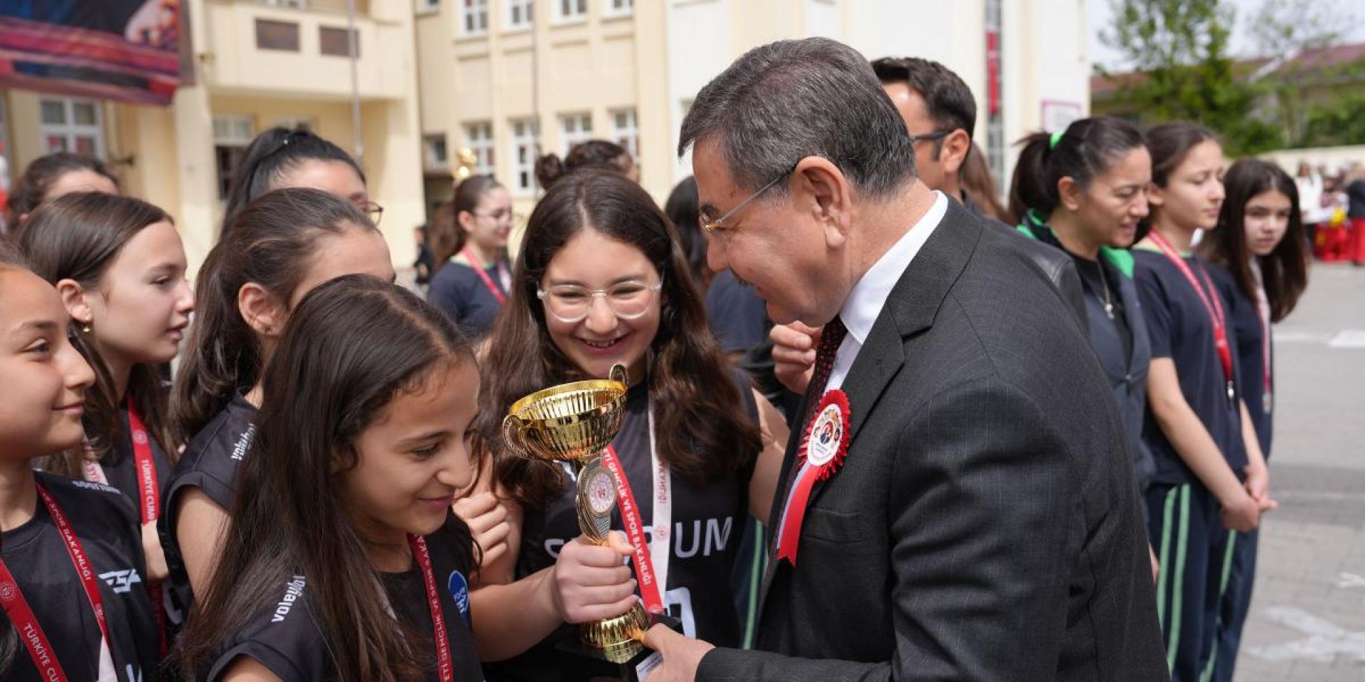 Yakup Odabaşı verirken üçüncü olan okulların kupa ve madalyalarını Cumhuriyet