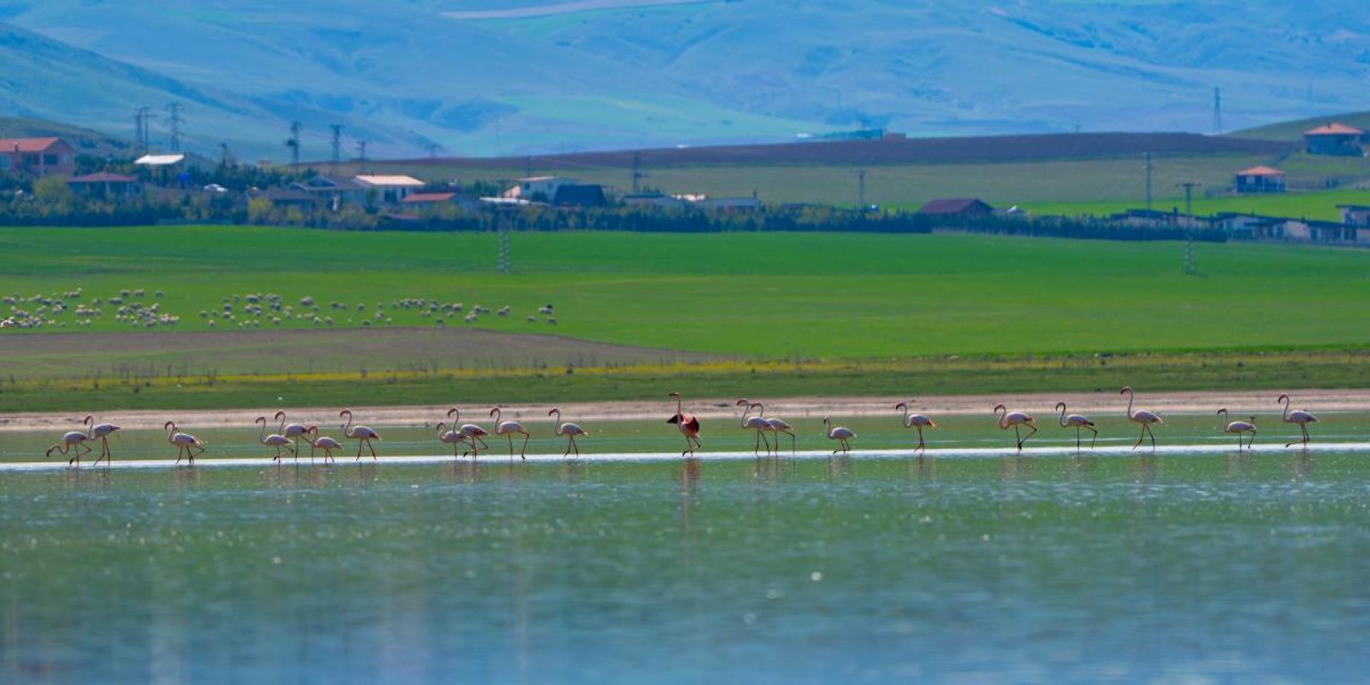 Flamingoların görsel şölenine tanık olmak isteyen doğa ve fotoğraf tutkunları, çayırlık alanlara akın ederek bu eşsiz manzarayı ölümsüzleştirdi.