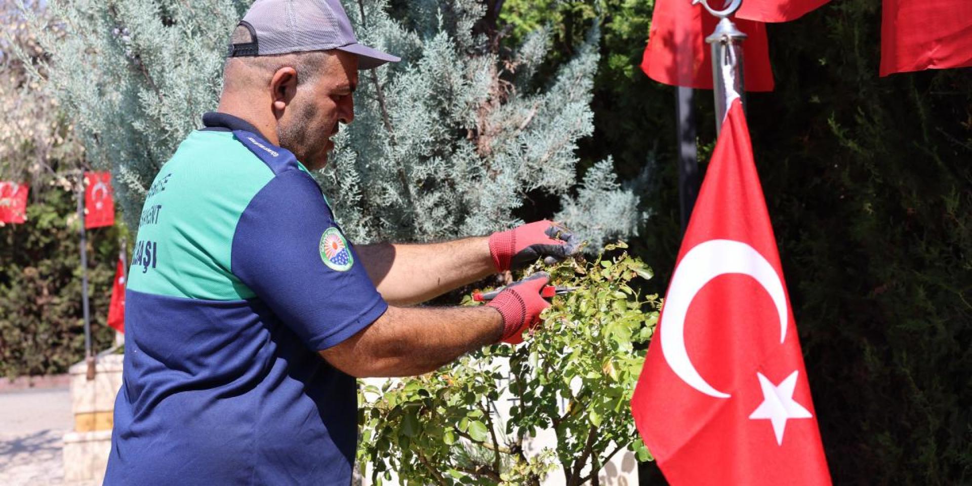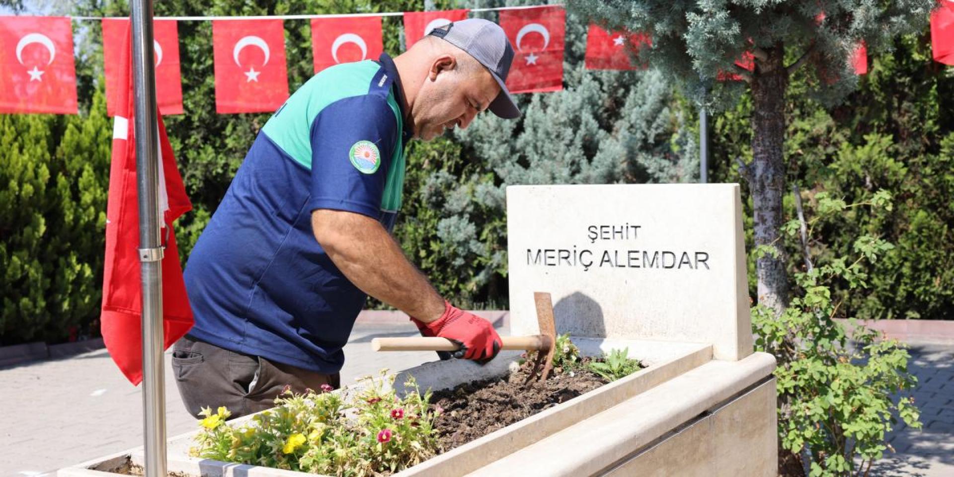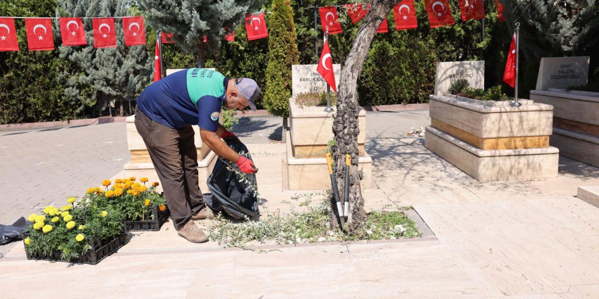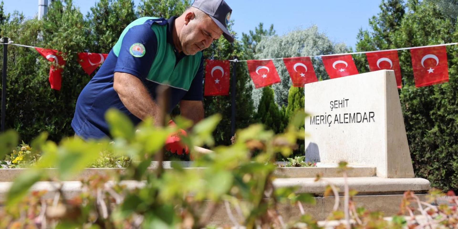 çalışmalar kapsamında, şehitliklerdeki çimler biçilirken, çevre düzenlemesi ve