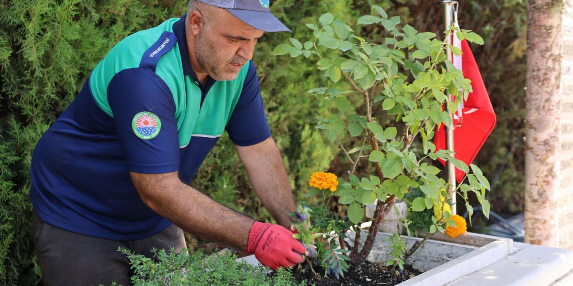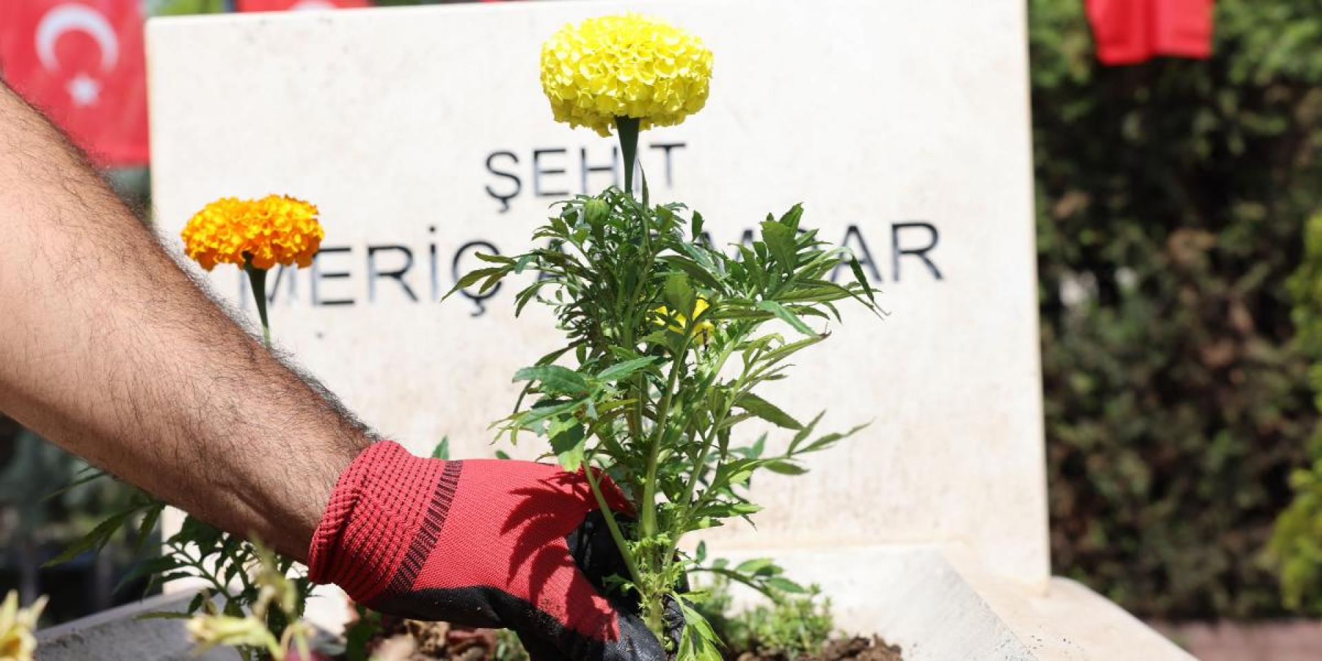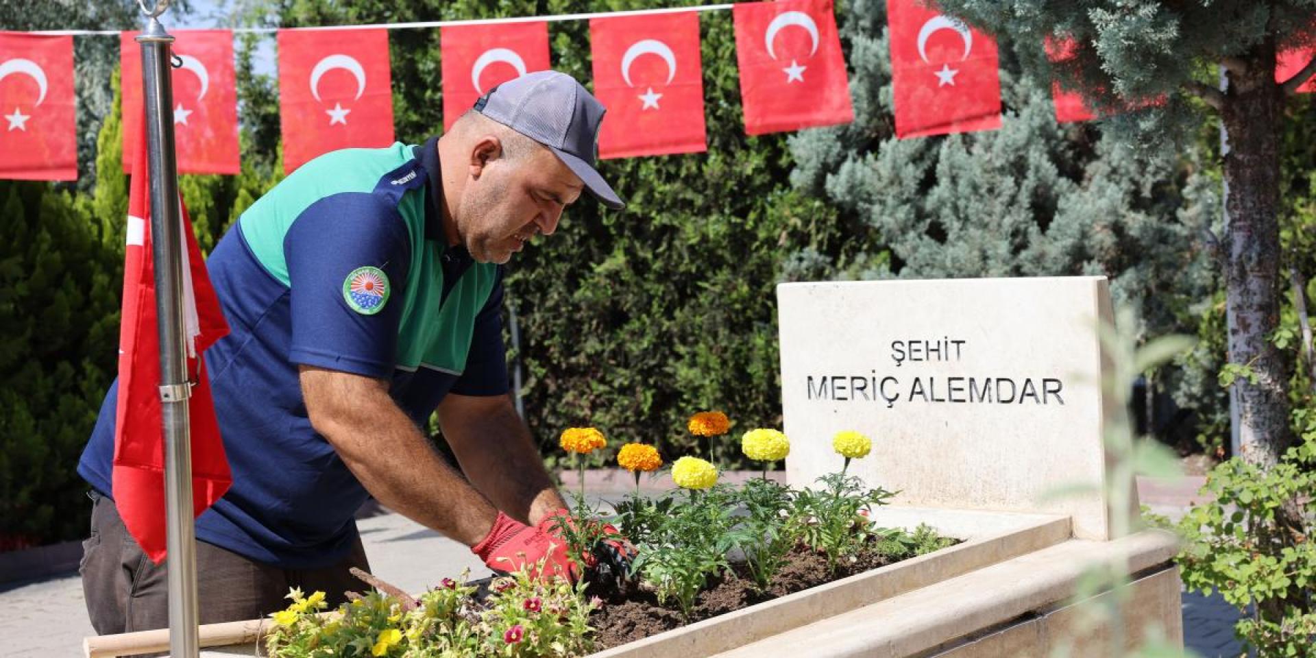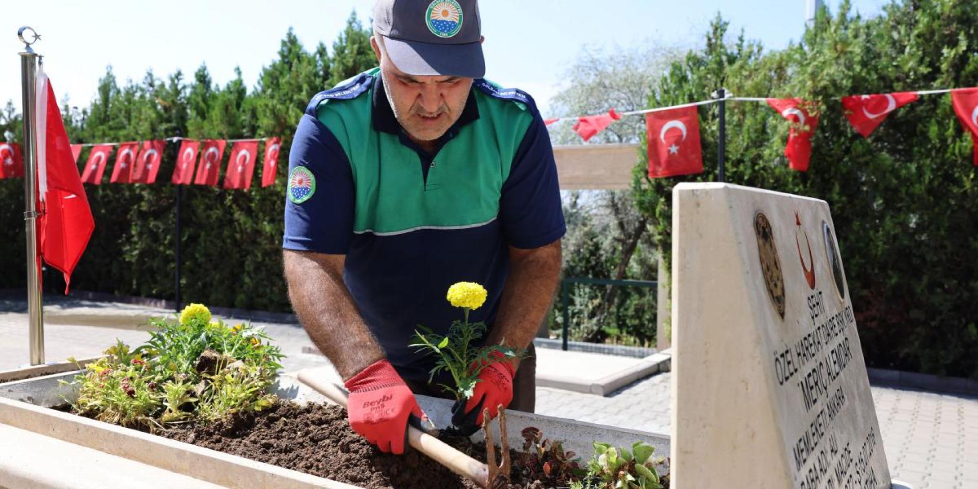 çalışmalar kapsamında, şehitliklerdeki çimler biçilirken, çevre düzenlemesi ve