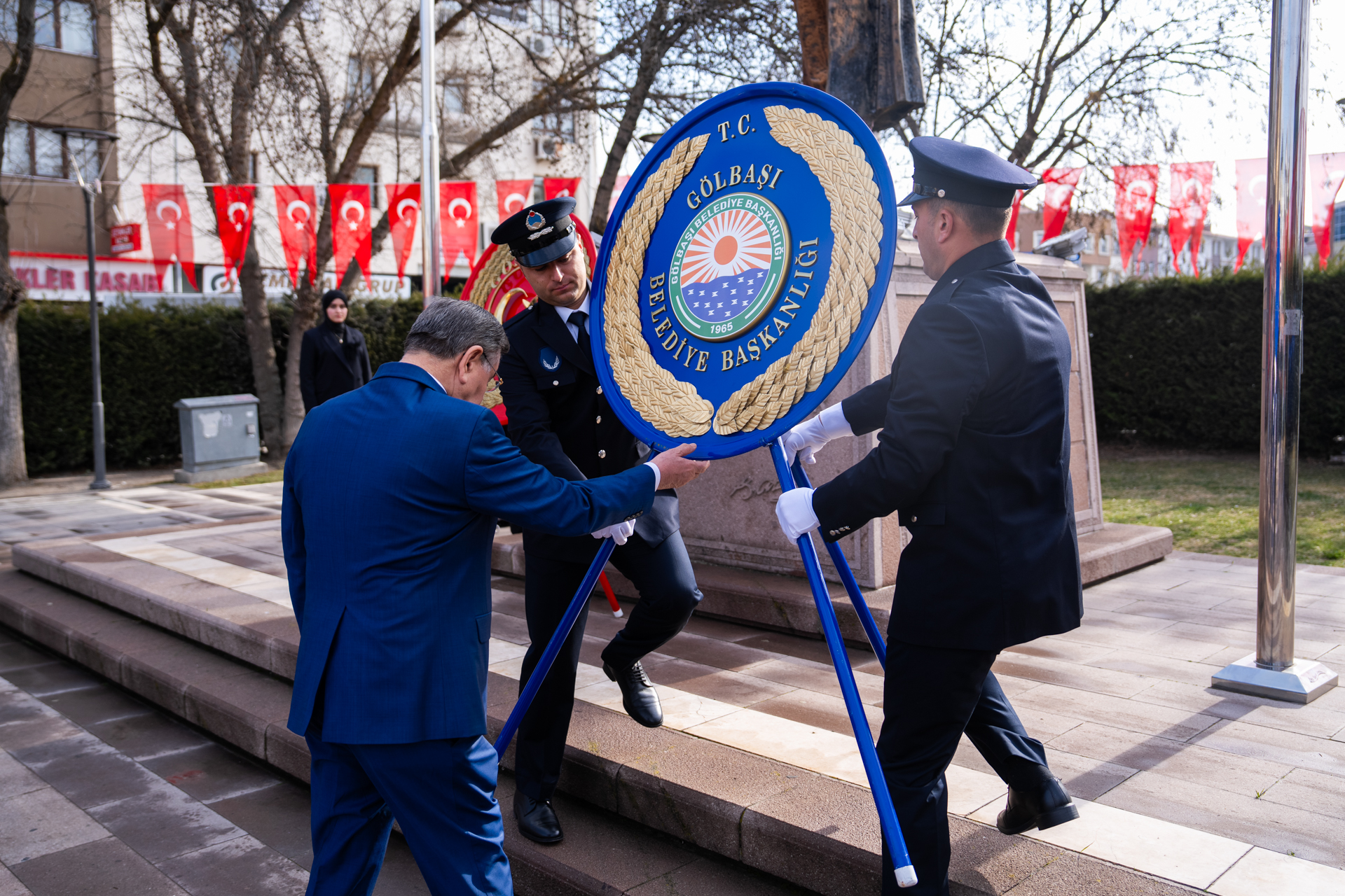Program, Cumhuriyet Meydanı’nda Atatürk Anıtı’na çelenk sunulmasıyla başladı. Düzenlenen törene Gölbaşı Kaymakamı Erol Rüstemoğlu, Gölbaşı Belediye Başkanı Yakup Odabaşı, ilçe protokolü, kamu kurum ve kuruluşlarının temsilcileri, muhtarlar, siyasi parti temsilcileri, sivil toplum kuruluşları, gaziler ve çok sayıda vatandaş katıldı.