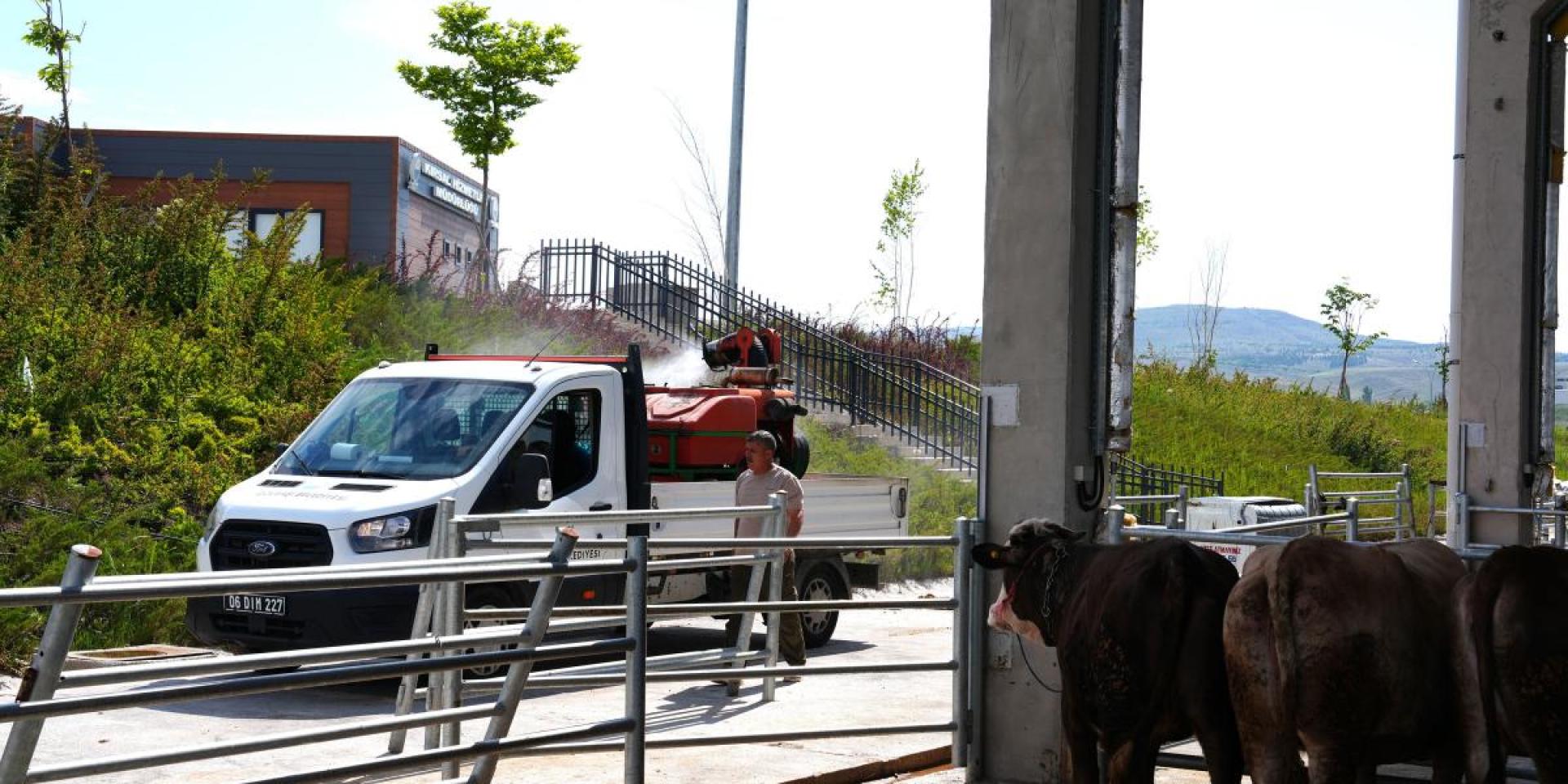 Kurban pazarında satıcıların ve alıcıların sağlıklı bir ortamda alışveriş yapabilmeleri için ilaçlamalar her gün düzenli olarak yapılıyor. Halk sağlığı ve hayvanların sağlığı için ilaçlamaların düzenli olarak Kurban Bayramı sonrasına kadar devam edileceği vurgulandı.